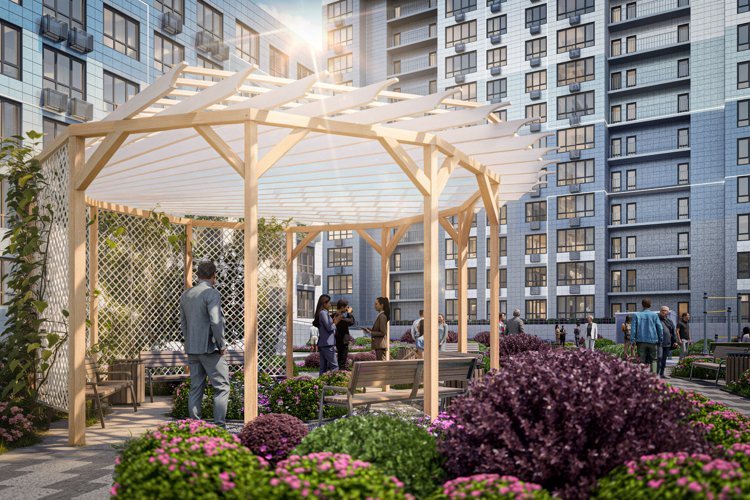 Двор ЖК — как отдельная галактика. Здесь вы сможете побыть в тишине и уединении, ведь вас не побеспокоят ни посторонние, ни даже шум машин. Зелёная территория ЖК создает ощущение уюта. Скамейки в тени деревьев — отличное место для отдыха и наслаждения видами природы прямо у дома.