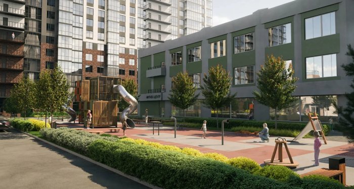Во внутреннем дворе учтено равномерное распределение всех его игровых и творческих элементов, чтобы жителям разных возрастов с разными интересами было интересно гулять во дворе своего дома: играть в настольный теннис, заниматься на тренажёрах, качаться на качелях, отдыхать в тени деревьев. Уютные крытые беседки в зелени и площадка-амфитеатр.