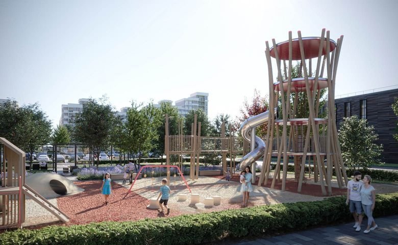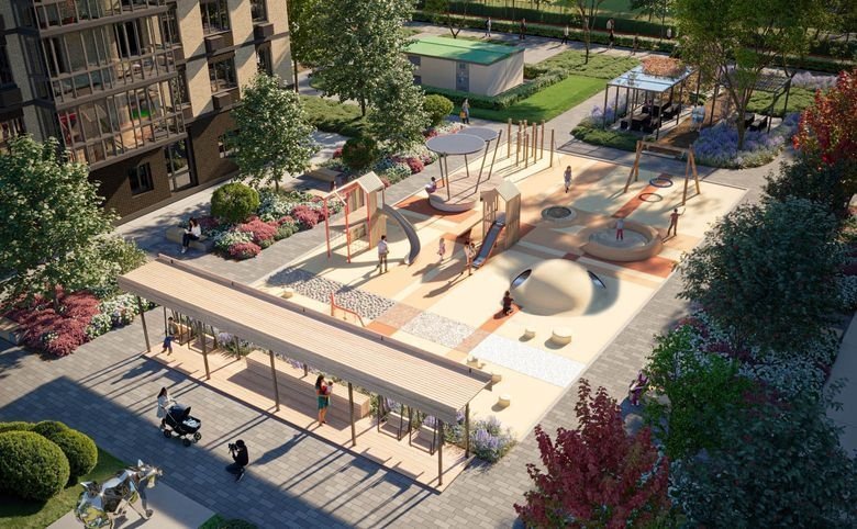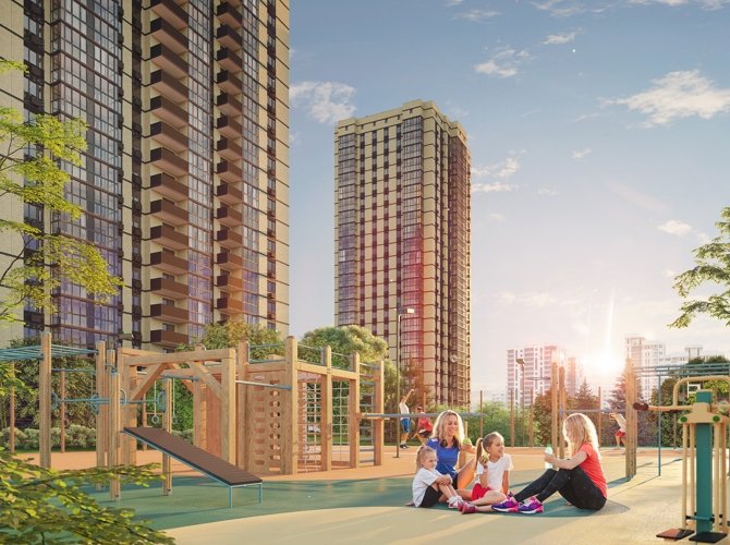 В ЖК выполнен ландшафтный дизайн с многоуровневым озеленением, расположены оборудованные воркаут-зоны, игровые площадки, футбольные поля, волейбольные и баскетбольные площадки, велодорожки.